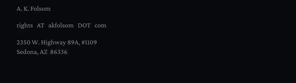 All text, images, graphics, design, and creative works appearing on this website are the property of A. K. Folsom unless otherwise noted, and are protected by copyright and intellectual property laws. Unauthorized use of any content is strictly prohibited.